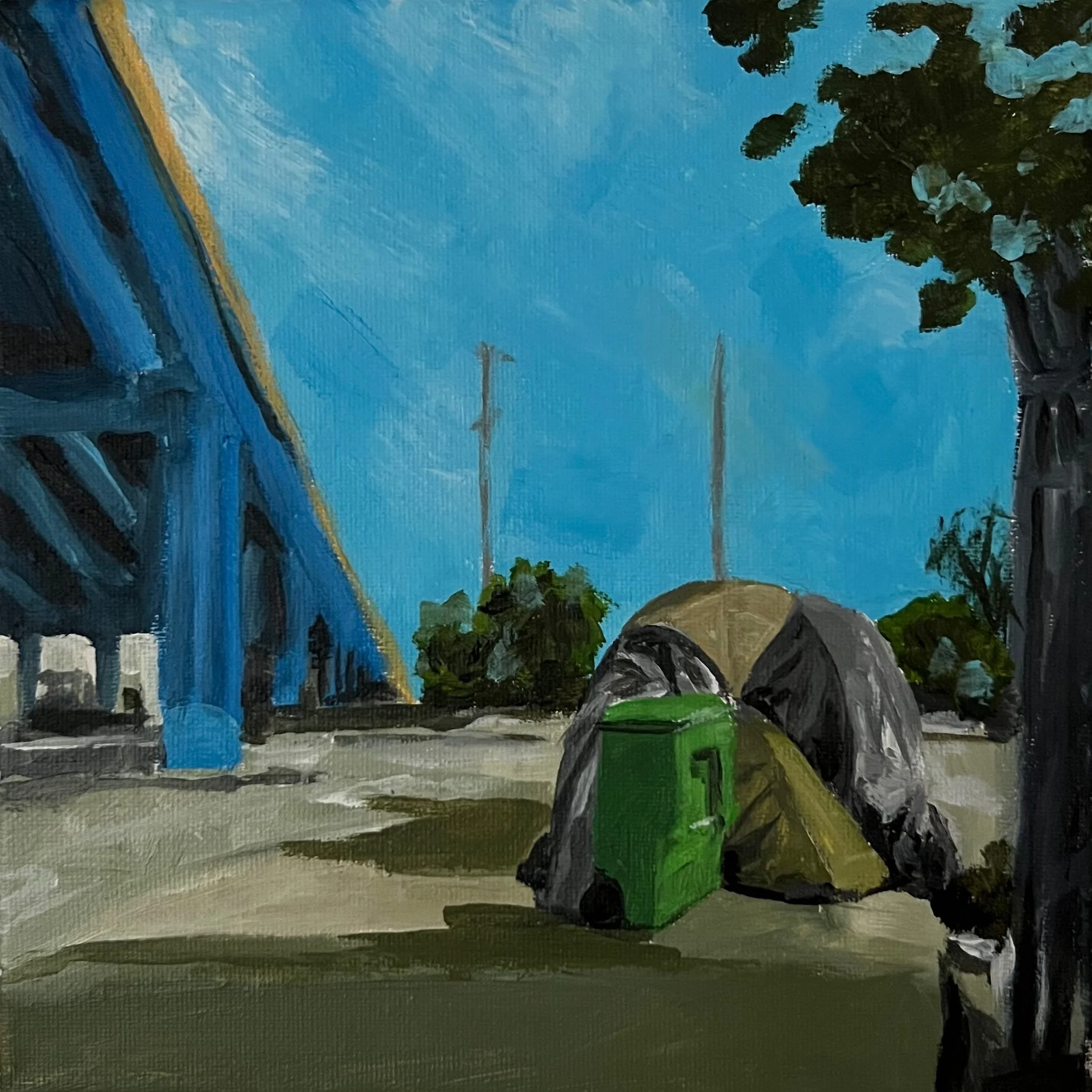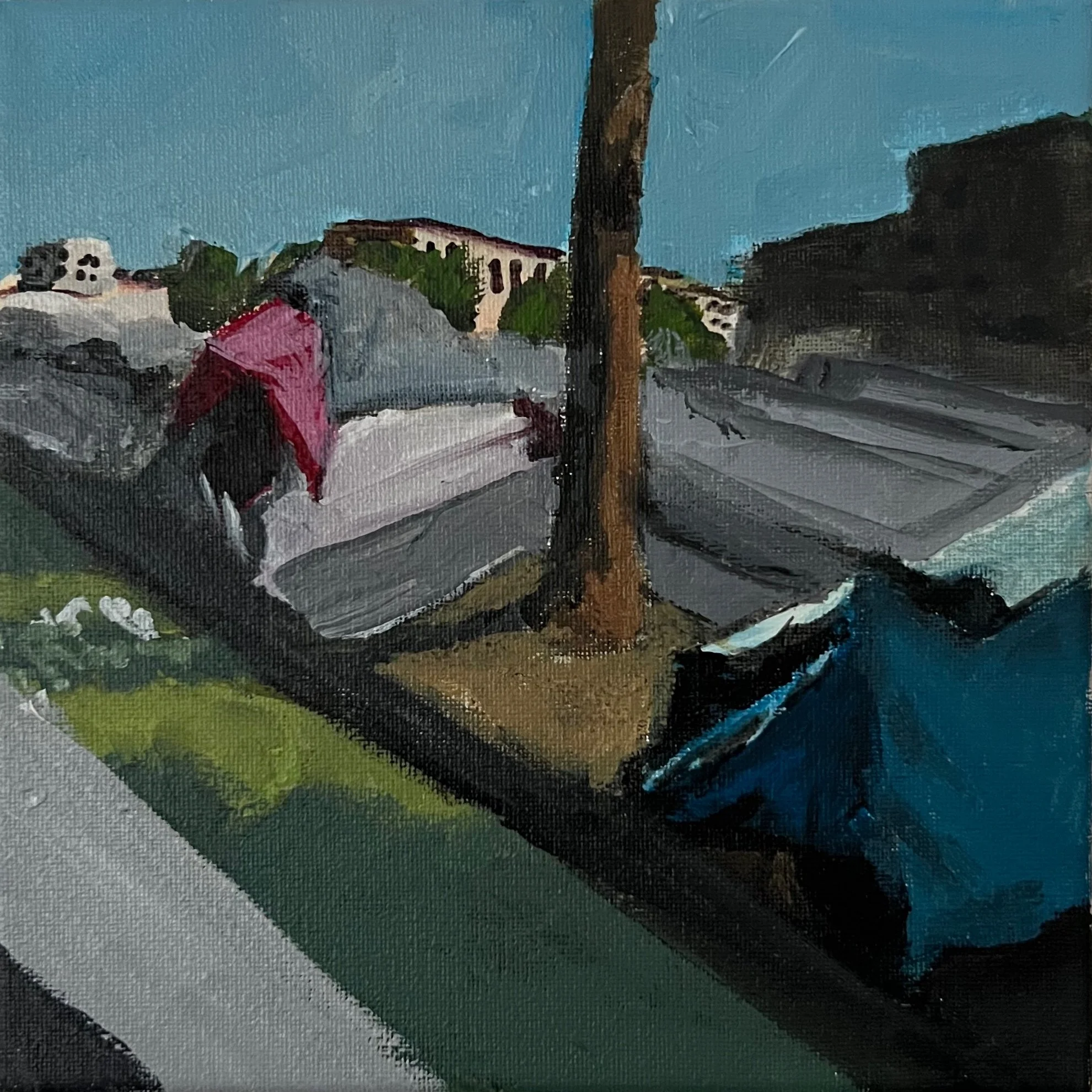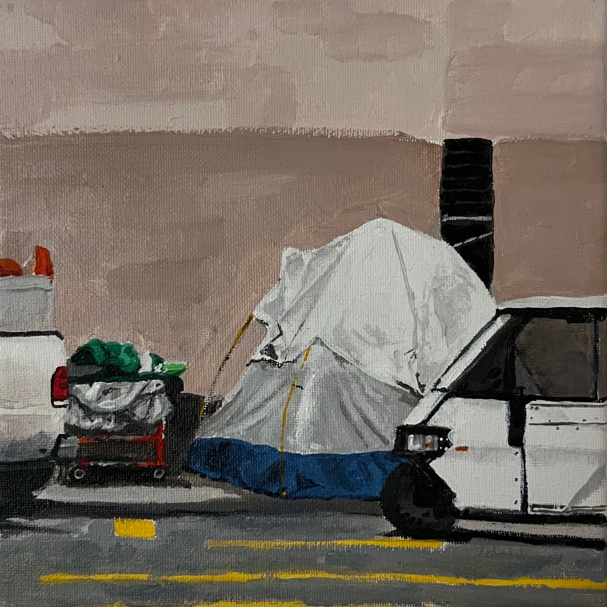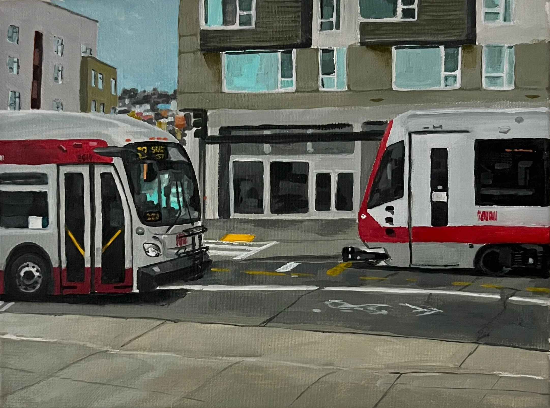 Life in Transit is a series of landscape paintings that capture my search for light and beauty on my well worn paths through San Francisco. Looking in unexpected places—on sidewalks, at bus stops, on public transit—I’ve discovered some of our city’s kindest, most authentic neighbors and the quiet dignity in the lives many judge and deliberately ignore.