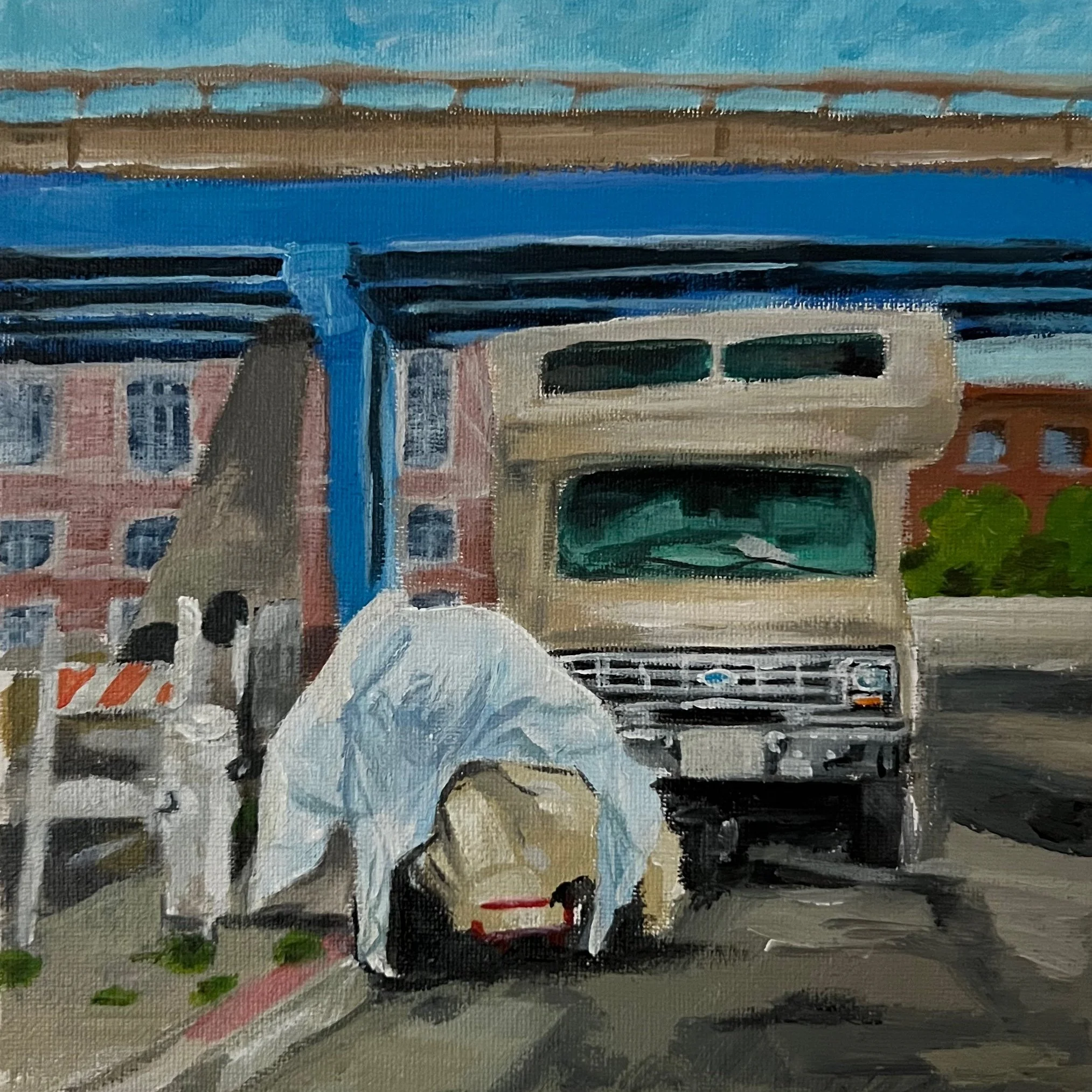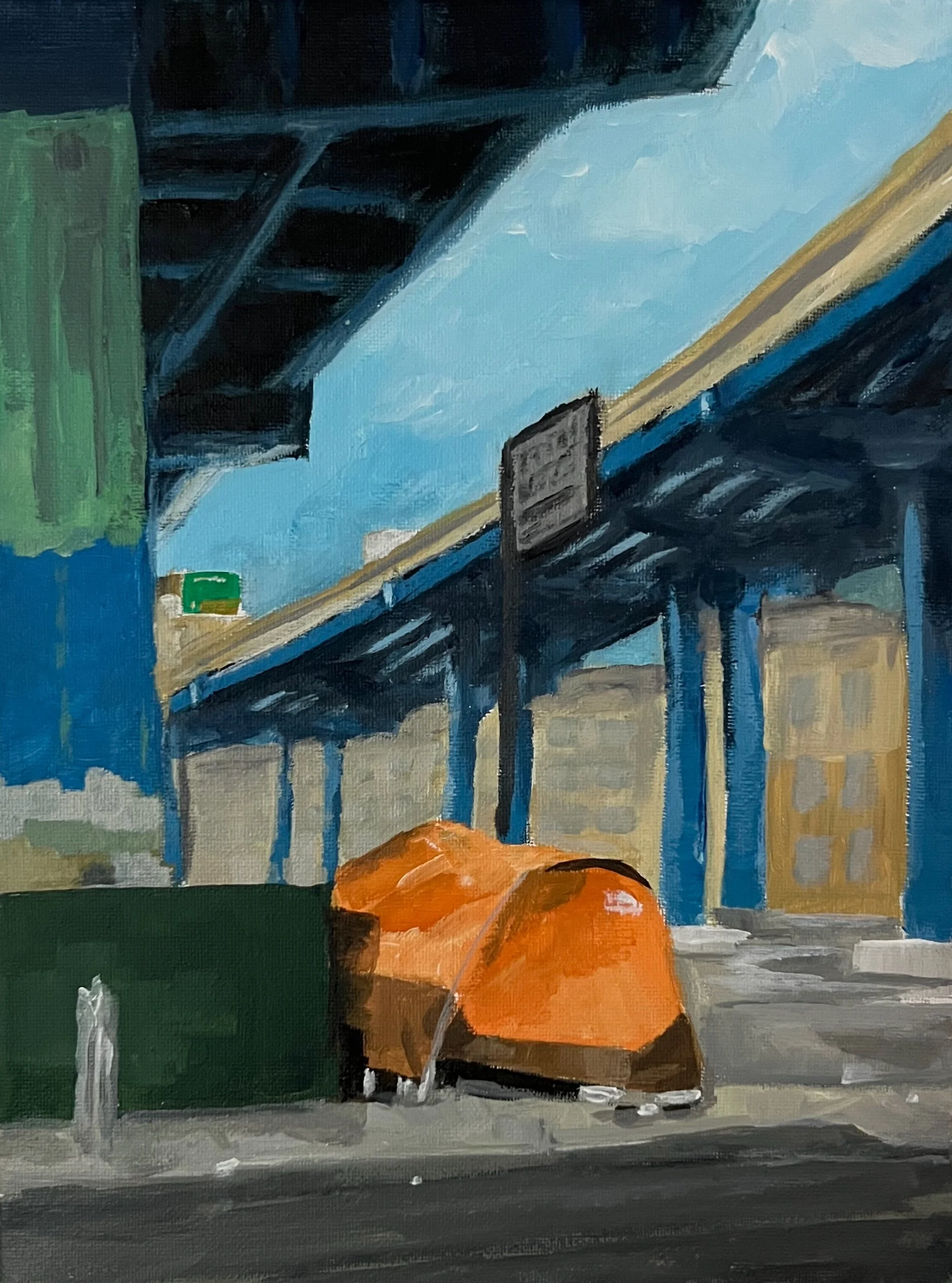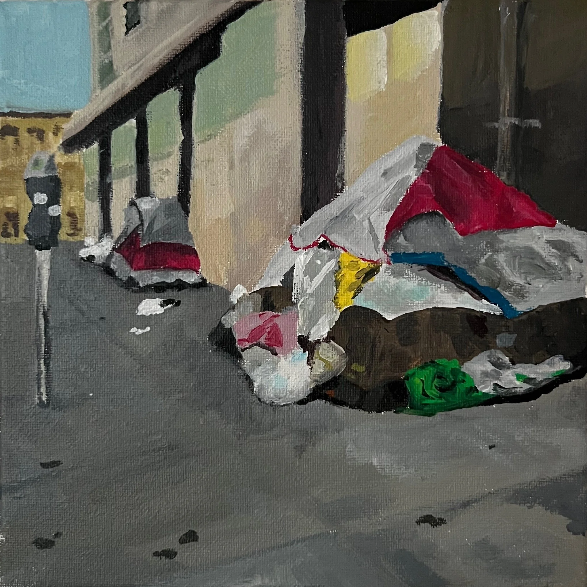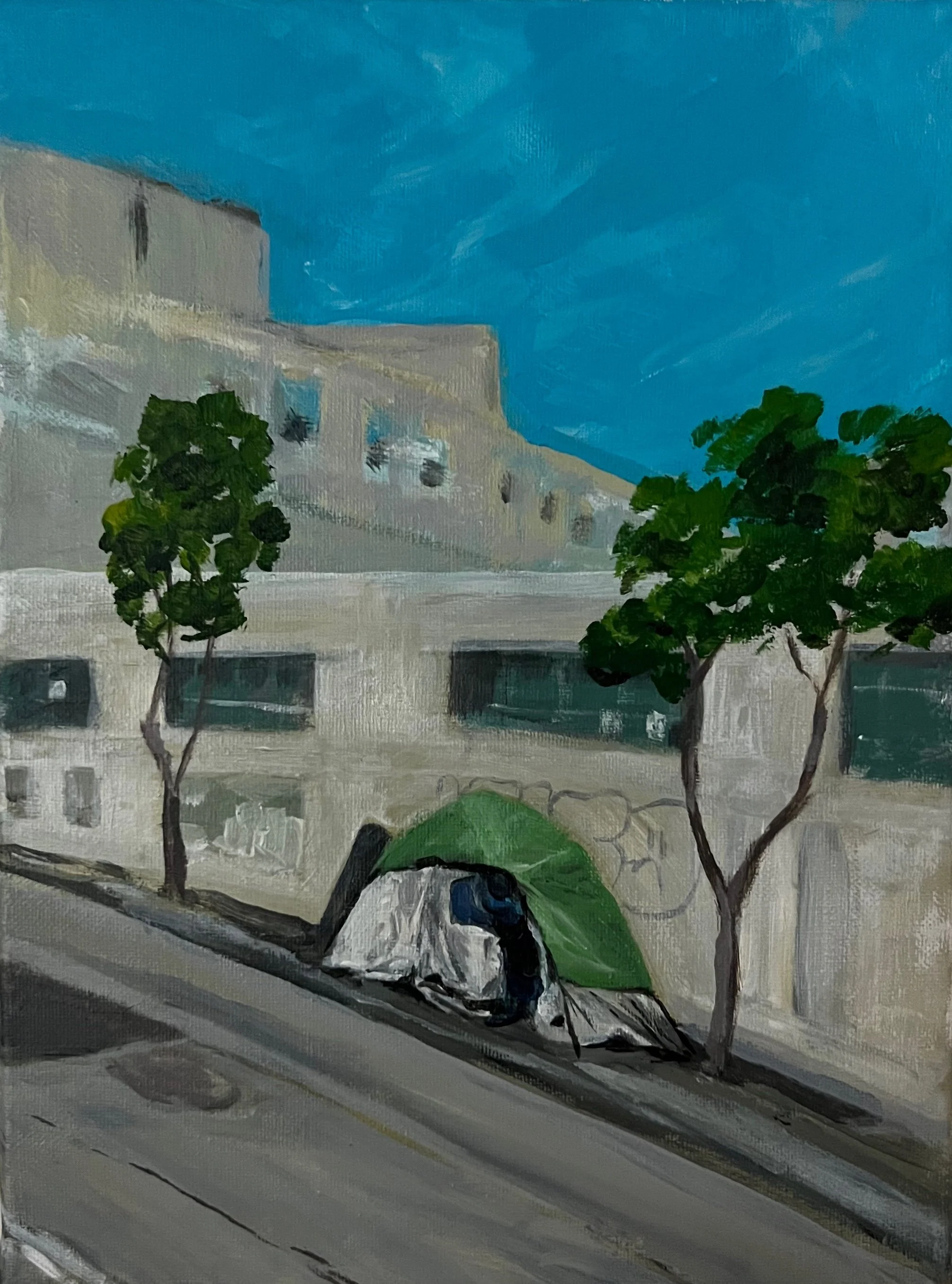 Life in Transit is a series of landscape paintings that capture my search for light and beauty on my well worn paths through San Francisco. Looking in unexpected places—on sidewalks, at bus stops, on public transit—I’ve discovered some of our city’s kindest, most authentic neighbors and the quiet dignity in the lives many judge and deliberately ignore.